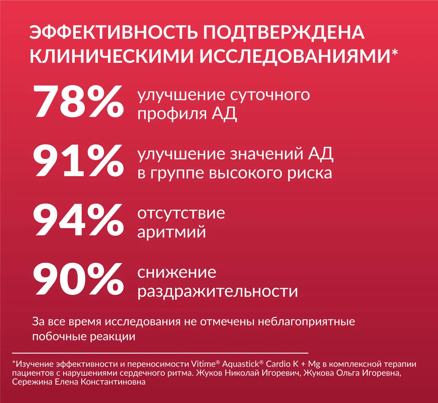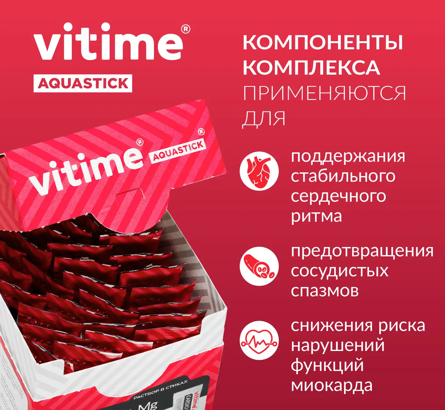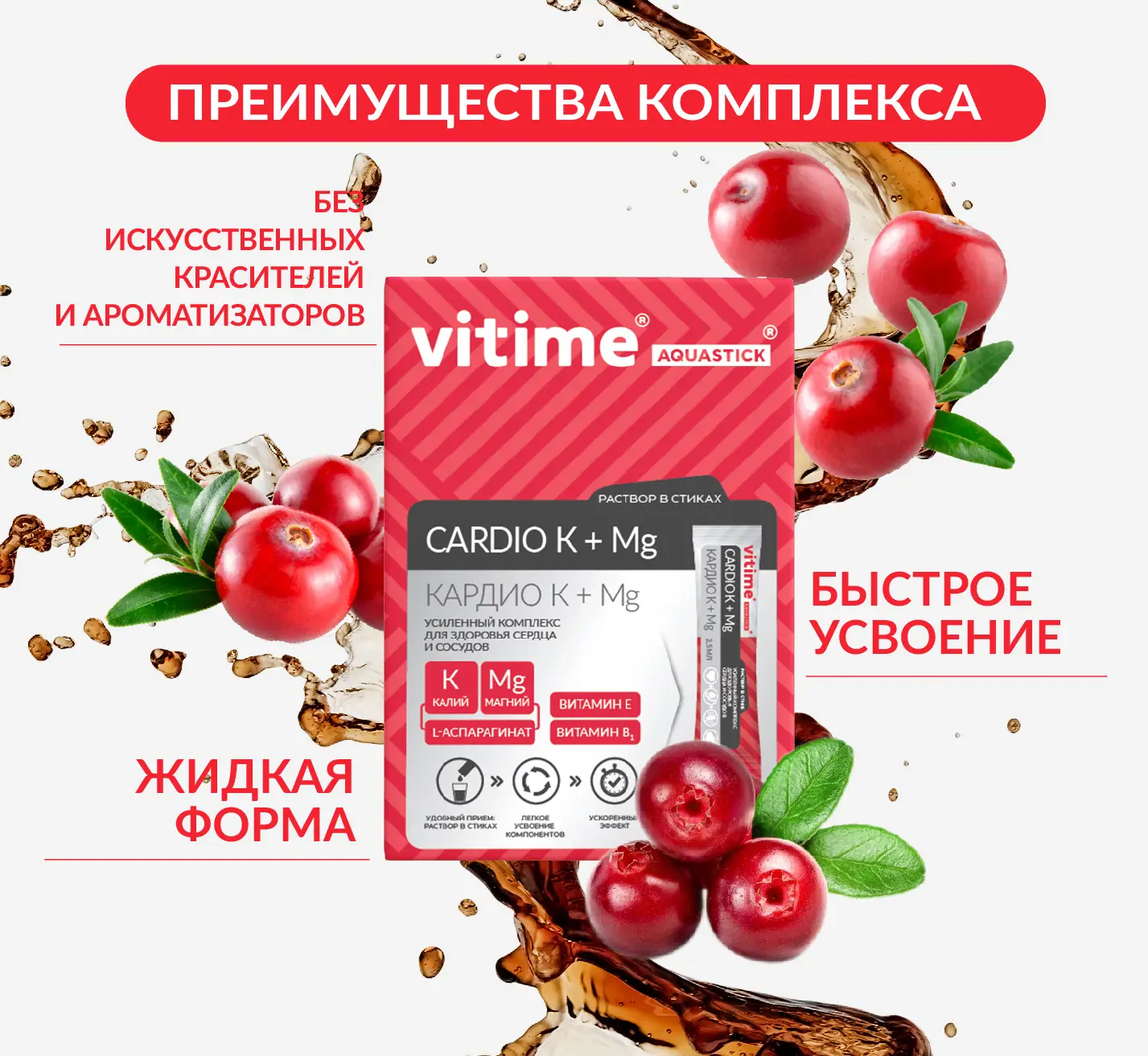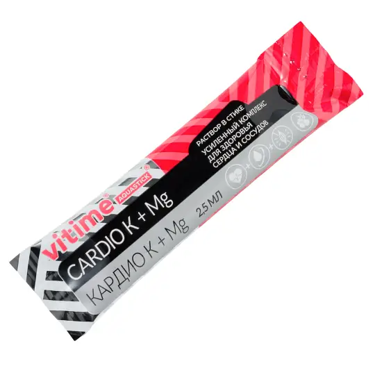 Мне VITime Aquastick Cardio K+Mg рекомендовал кардиолог, препарат калия и магния для снижения риска сердечно-сосудистых заболеваний мне необходимы для поддержания хорошего самочувствия. Мне нравится, что он растворяется в воде, так как раствор быстро начинает действовать, удобно брать с собой. Врачей слушаю, все назначения выполняю, витаминному комплексу VITime Aquastick Cardio K+Mg ставлю оценку 5+!