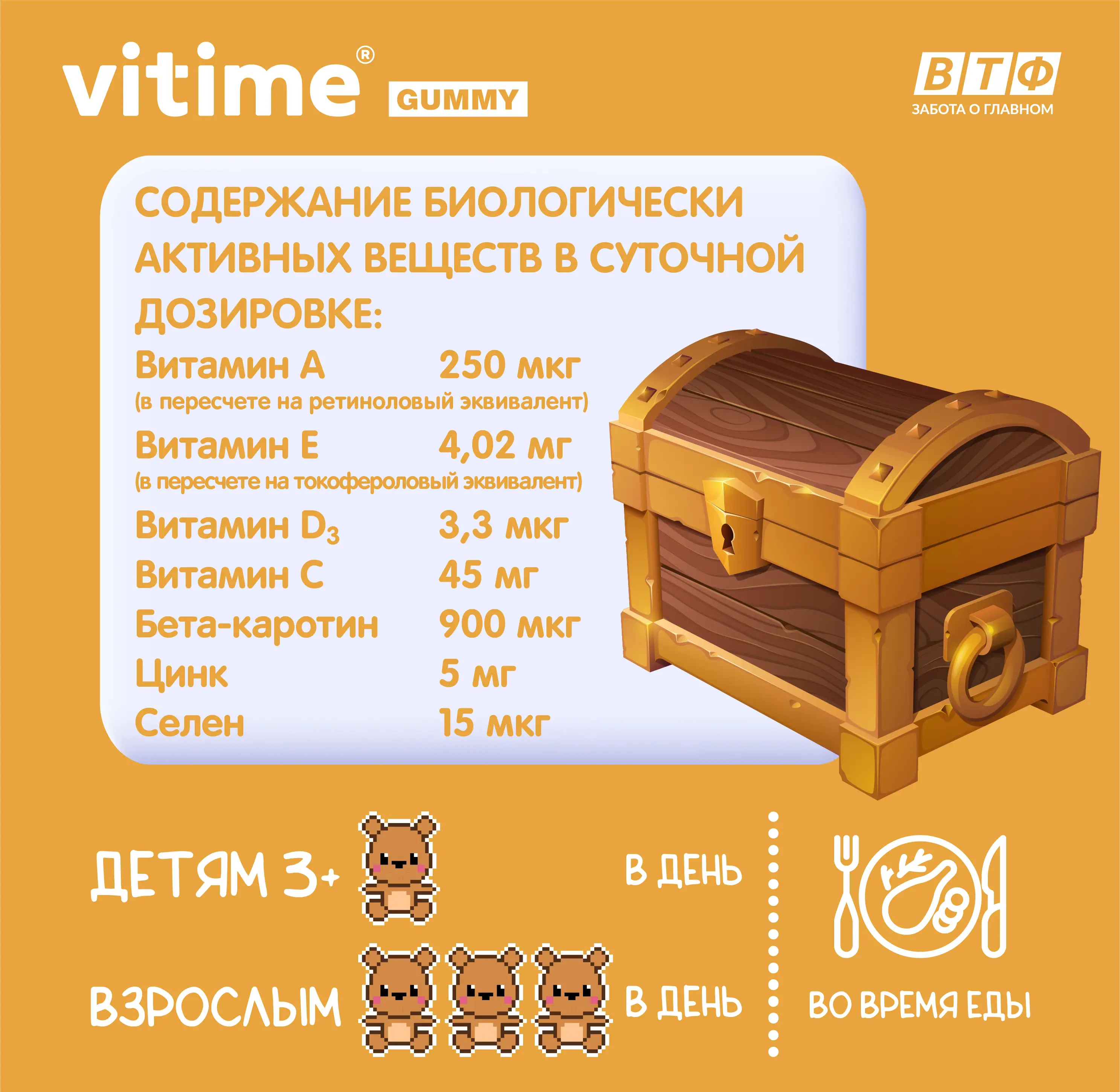 Совместный прием мармеладных пастилок VITime Gummy Иммуно и VITime Gummy Витамин D3 для детей допустим. Рекомендуем проконсультироваться с врачом-педиатром для назначения оптимального курса.