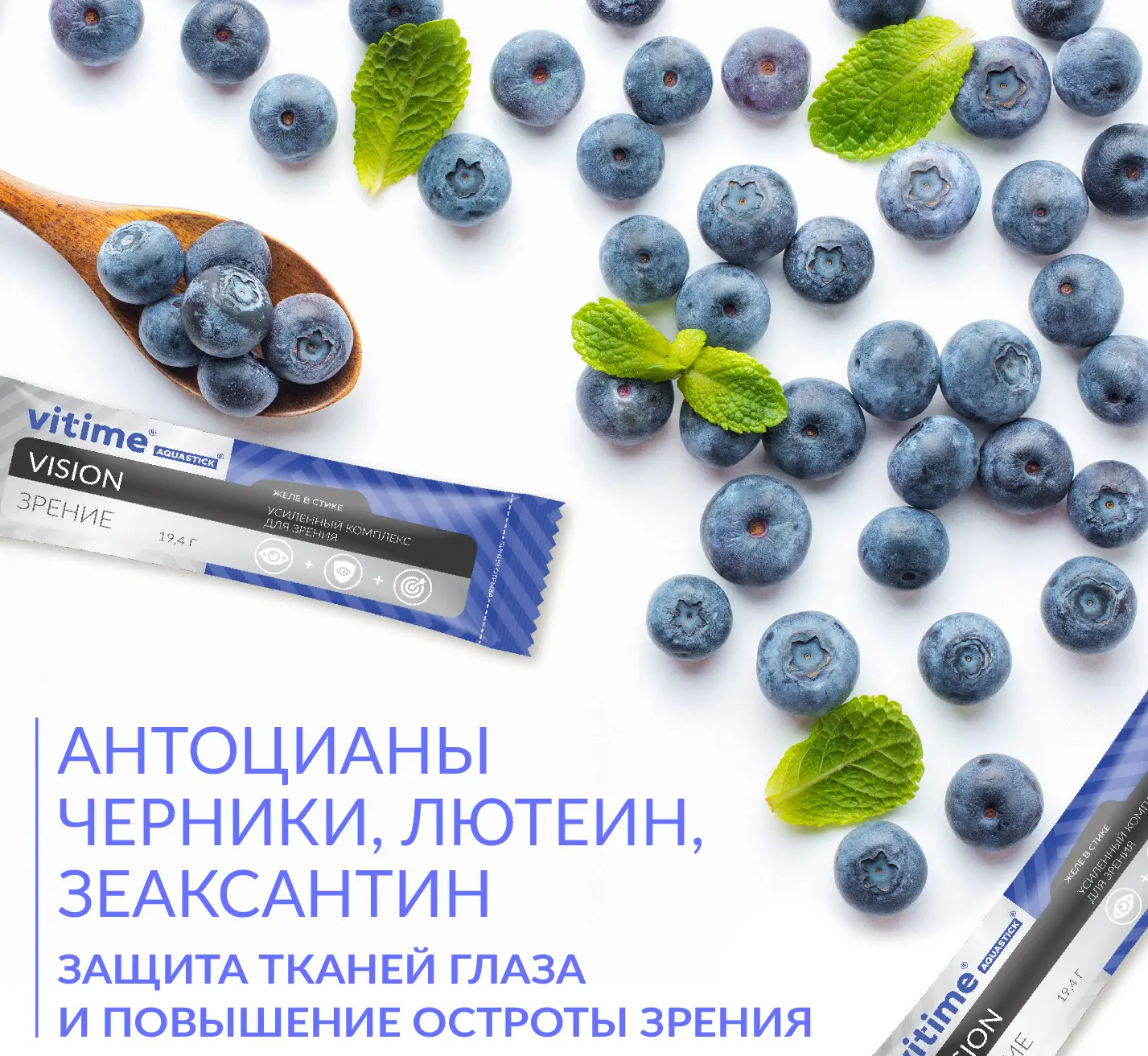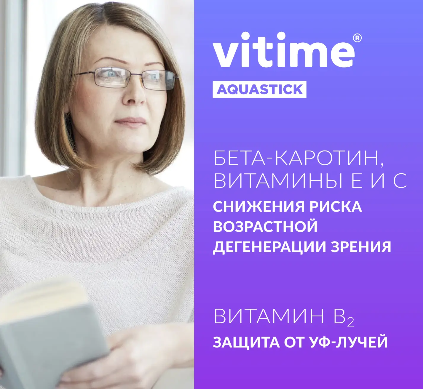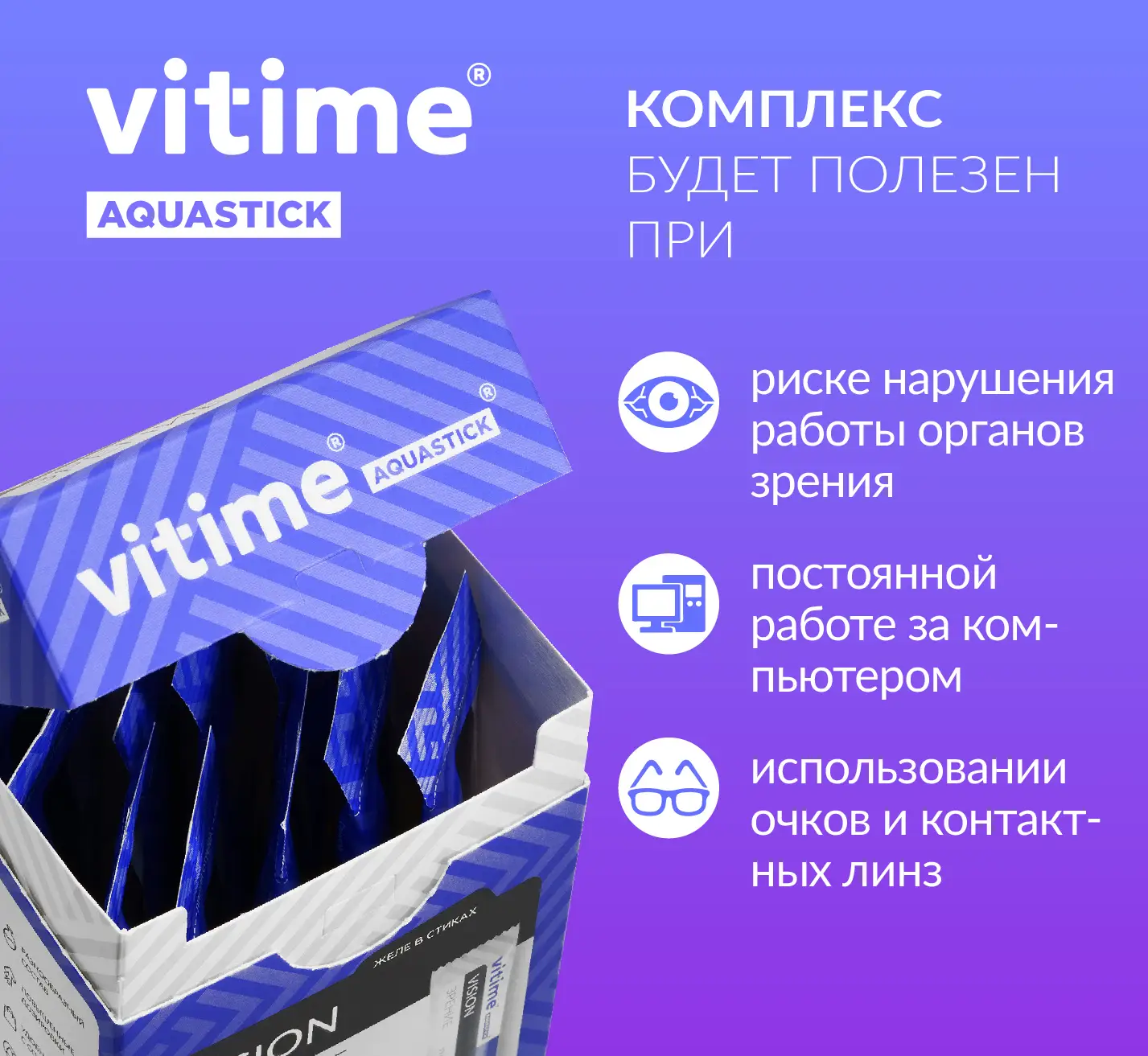VITime Aquastick Vision (Витайм Аквастик Вижн) можно принимать с 18 лет. Для детей рекомендуем VITime Gummy Зрение, детские витамины для зрения с лютеином и черникой.
