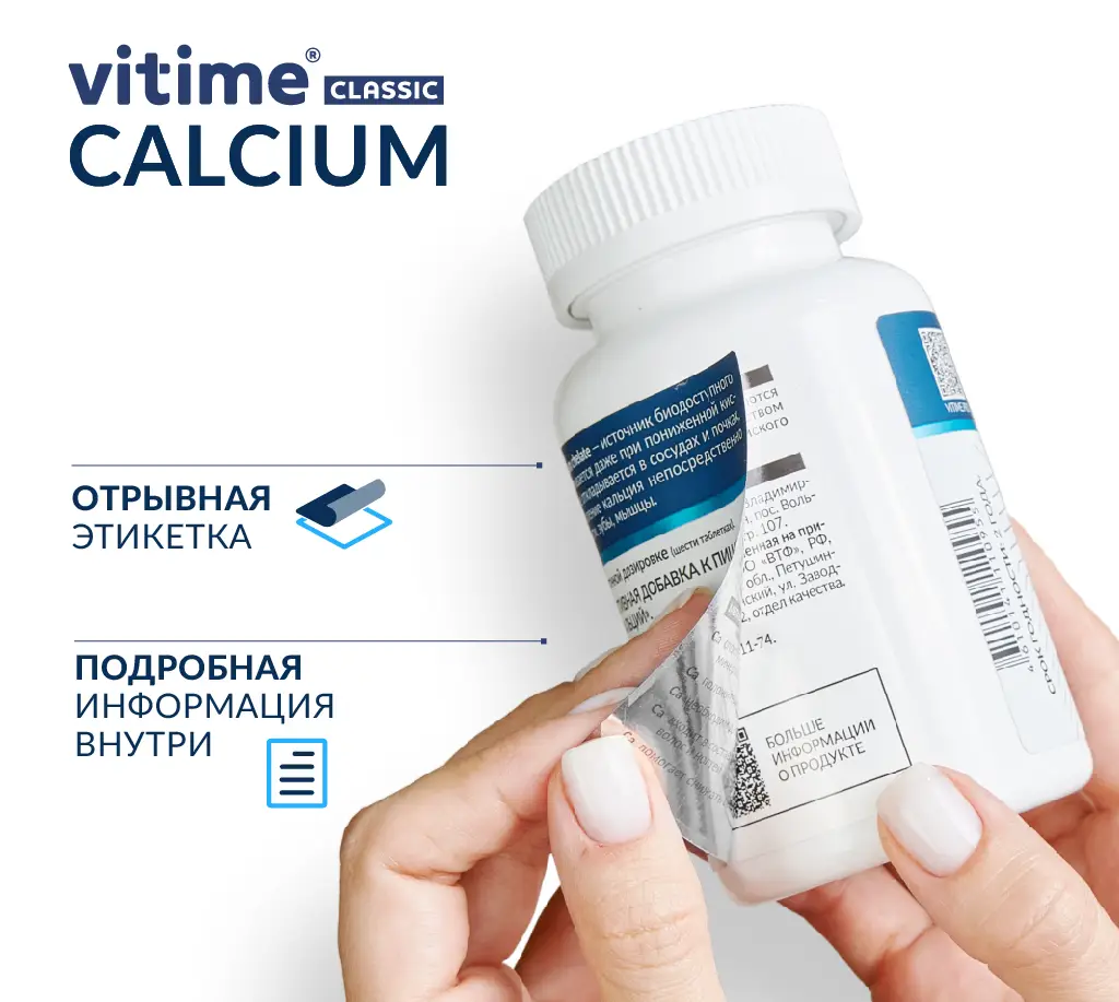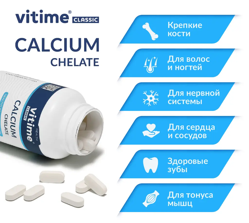 Состав 1 таблетки VITime Classic Calcium Chelate: кальция бисглицинат; носитель: микрокристаллическая целлюлоза; кальция цитрат; носители: поливинилпирролидон, гидроксипропилметилцеллюлоза, кроскарамеллоза натрия; мальтодекстрин; антислёживающий агент: тальк; краситель диоксид титана; носитель: полиэтиленгликоль; антислёживающие агенты: диоксид кремния аморфный, магниевая соль стеариновой кислоты (магния стеарат).