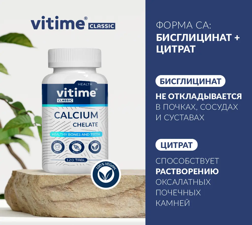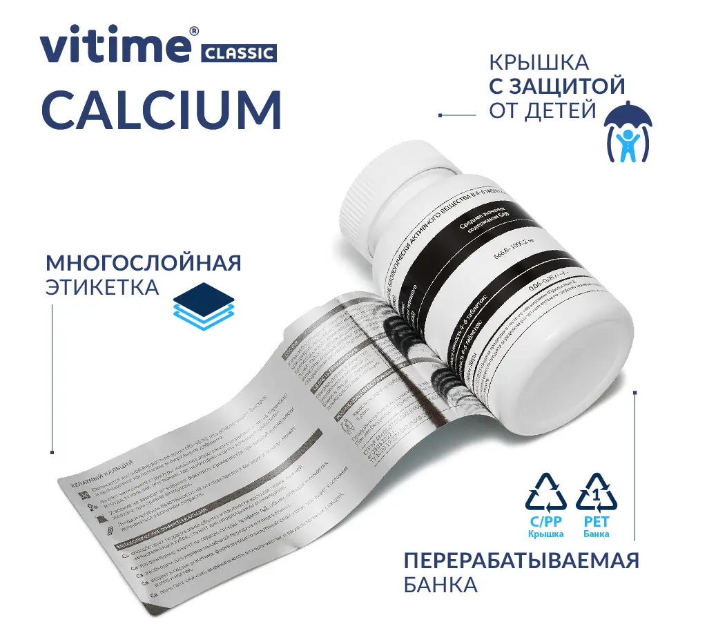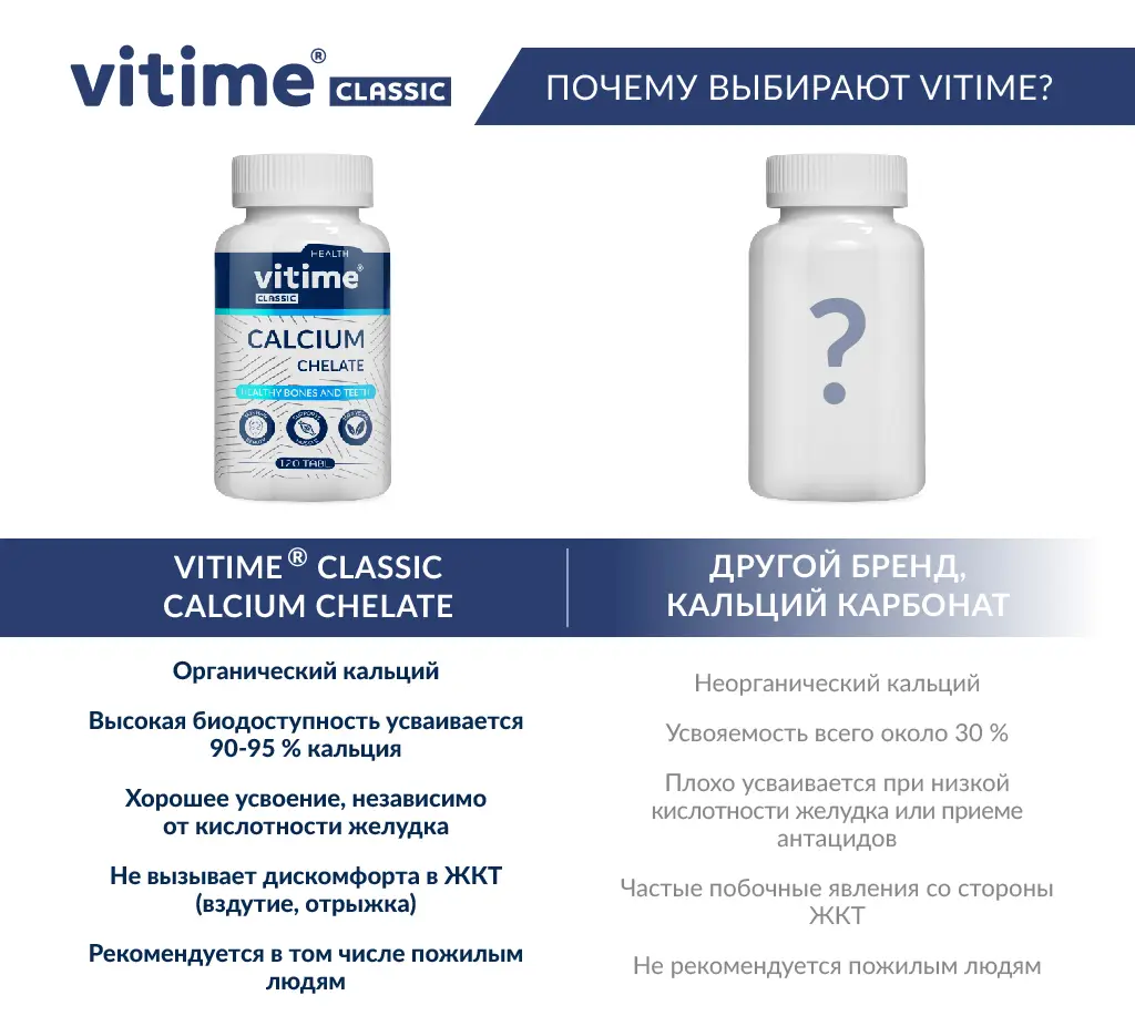 Благодаря тому, что в VITime Classic Calcium Chelate кальций представлен в органической форме хелата, дополнительный прием витаминов D3 или B6 не требуется. Хелатный кальций усваивается на 95%, в отличие от неорганических форм.