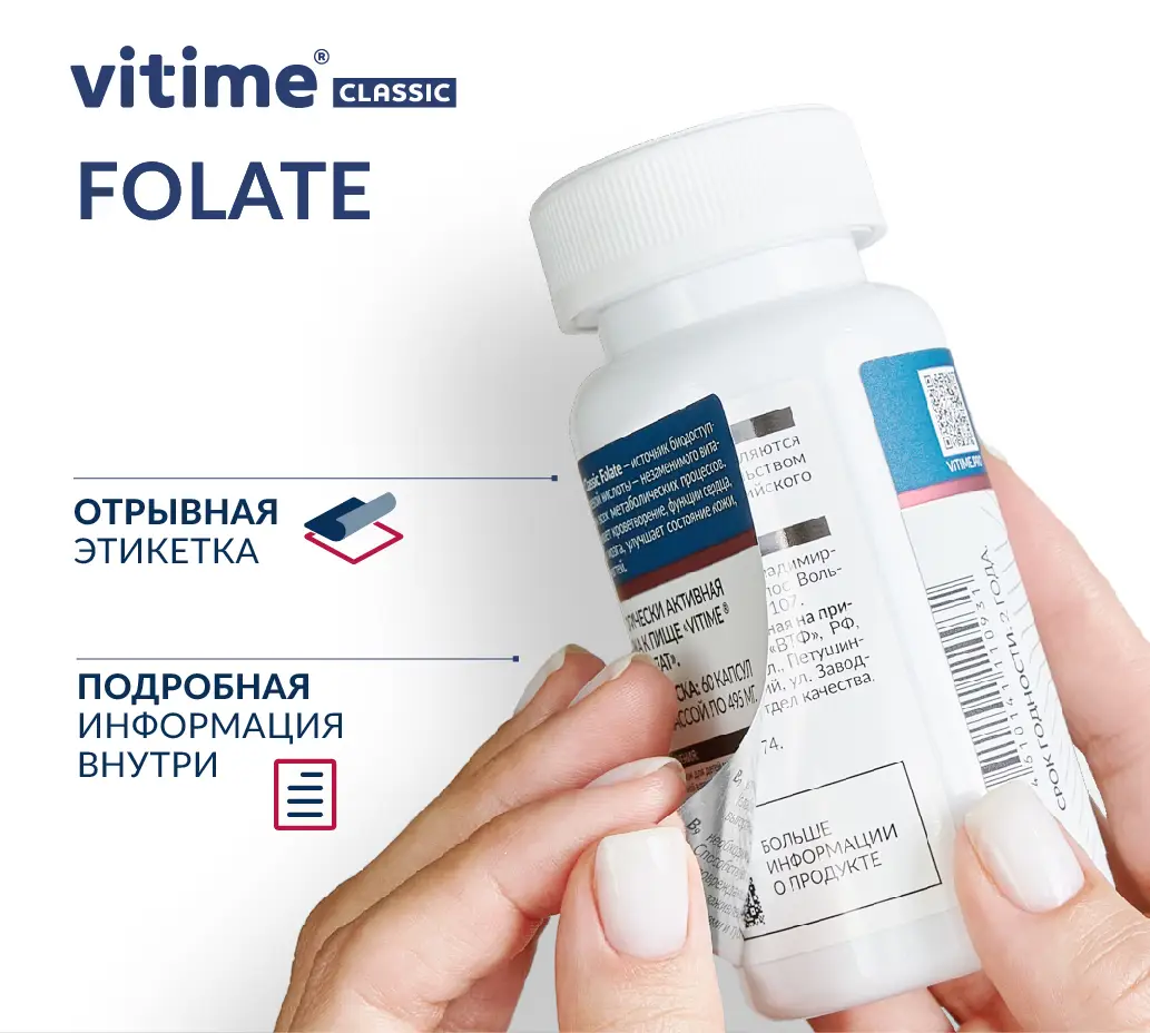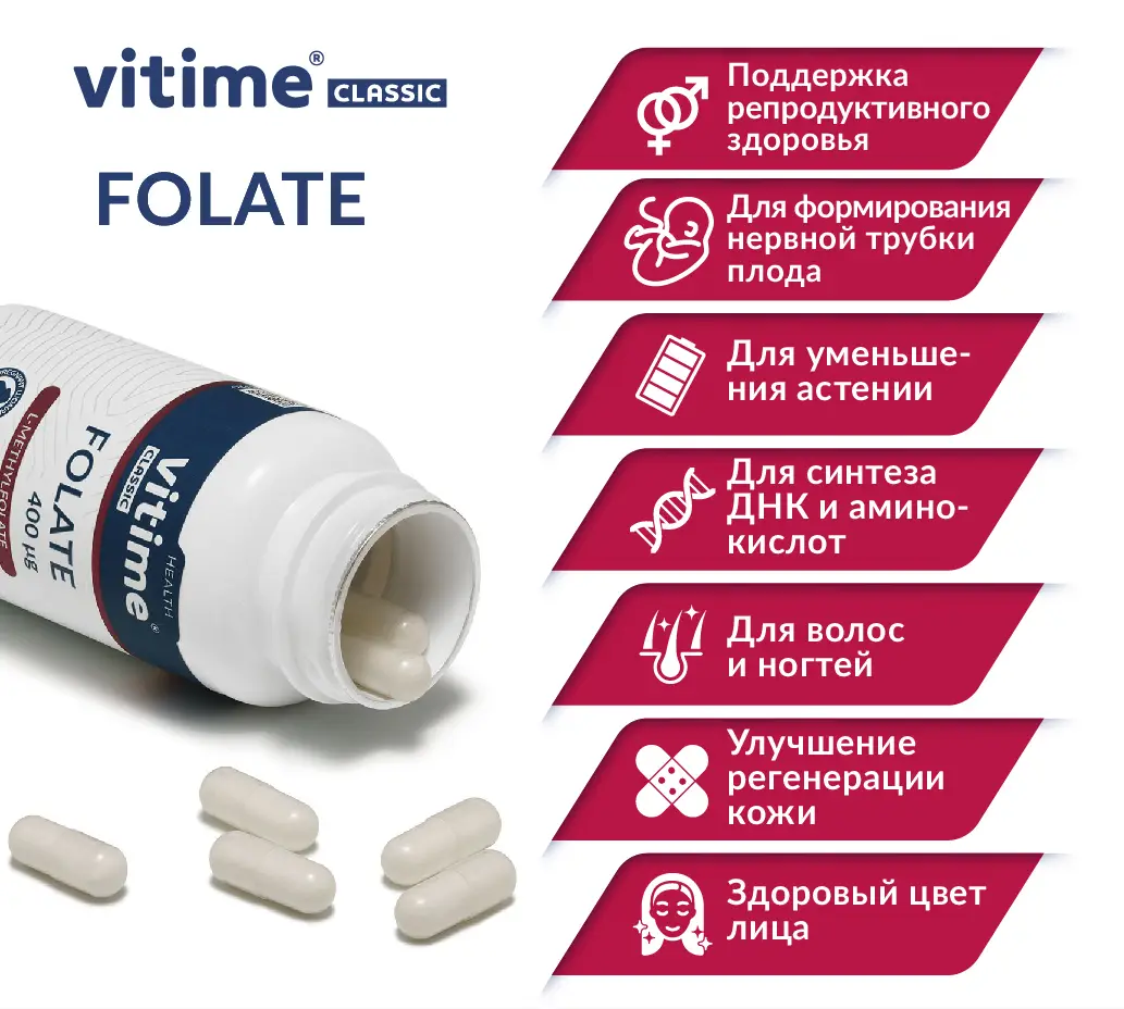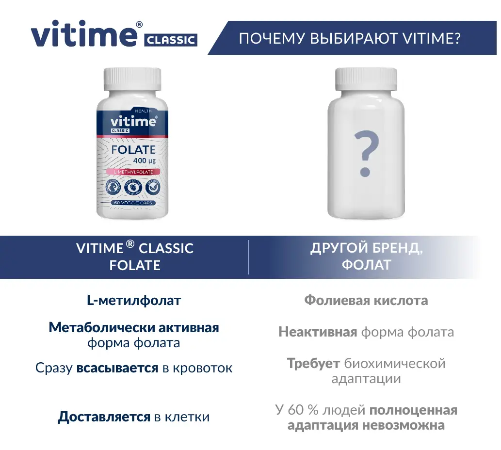 Состав VITime Classic Folate: носитель: микрокристаллическая целлюлоза; капсула (загуститель: пуллулан; желирующие агенты: калия хлорид, каррагинан или носитель: гидроксипропилметилцеллюлоза, или желатин); антислёживающие агенты: магниевая соль стеариновой кислоты (магния стеарат), диоксид кремния аморфный; метилфолат кальция. Дозировка: 400 мкг в форме L-метилфолата.
