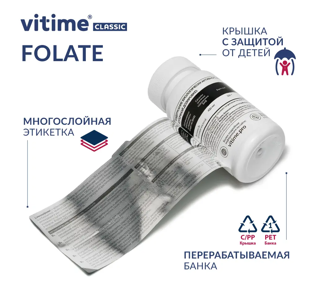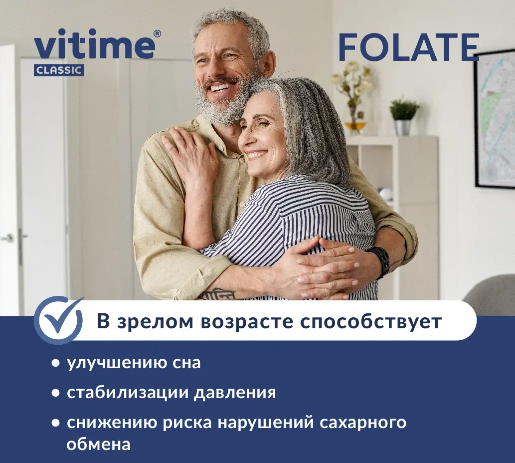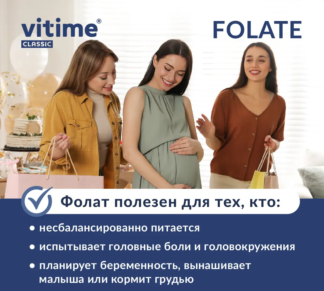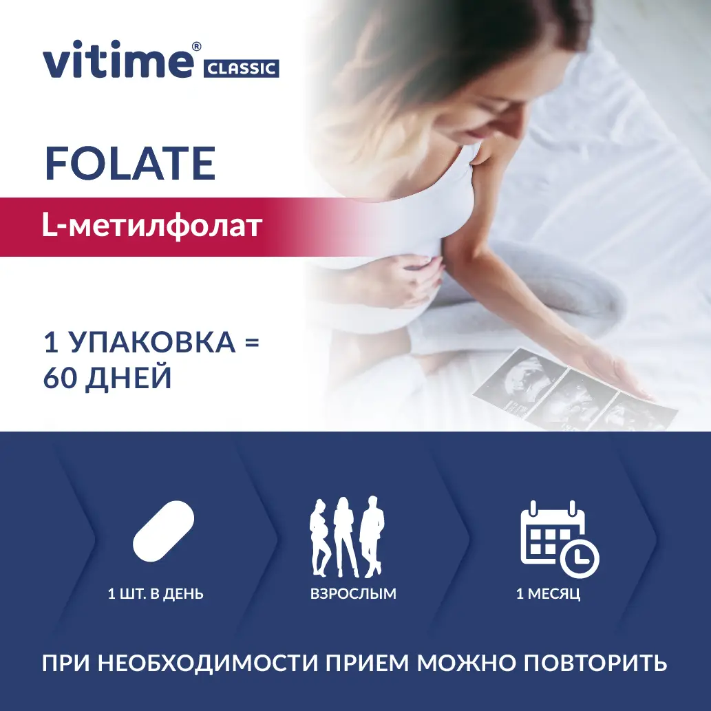 Состав VITime Classic Folate: носитель: микрокристаллическая целлюлоза; капсула (загуститель: пуллулан; желирующие агенты: калия хлорид, каррагинан или носитель: гидроксипропилметилцеллюлоза, или желатин); антислёживающие агенты: магниевая соль стеариновой кислоты (магния стеарат), диоксид кремния аморфный; метилфолат кальция. Дозировка: 400 мкг в форме L-метилфолата.