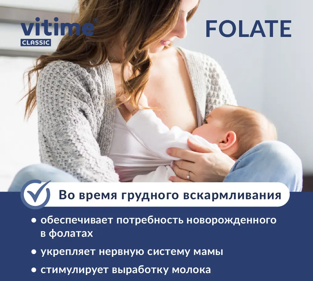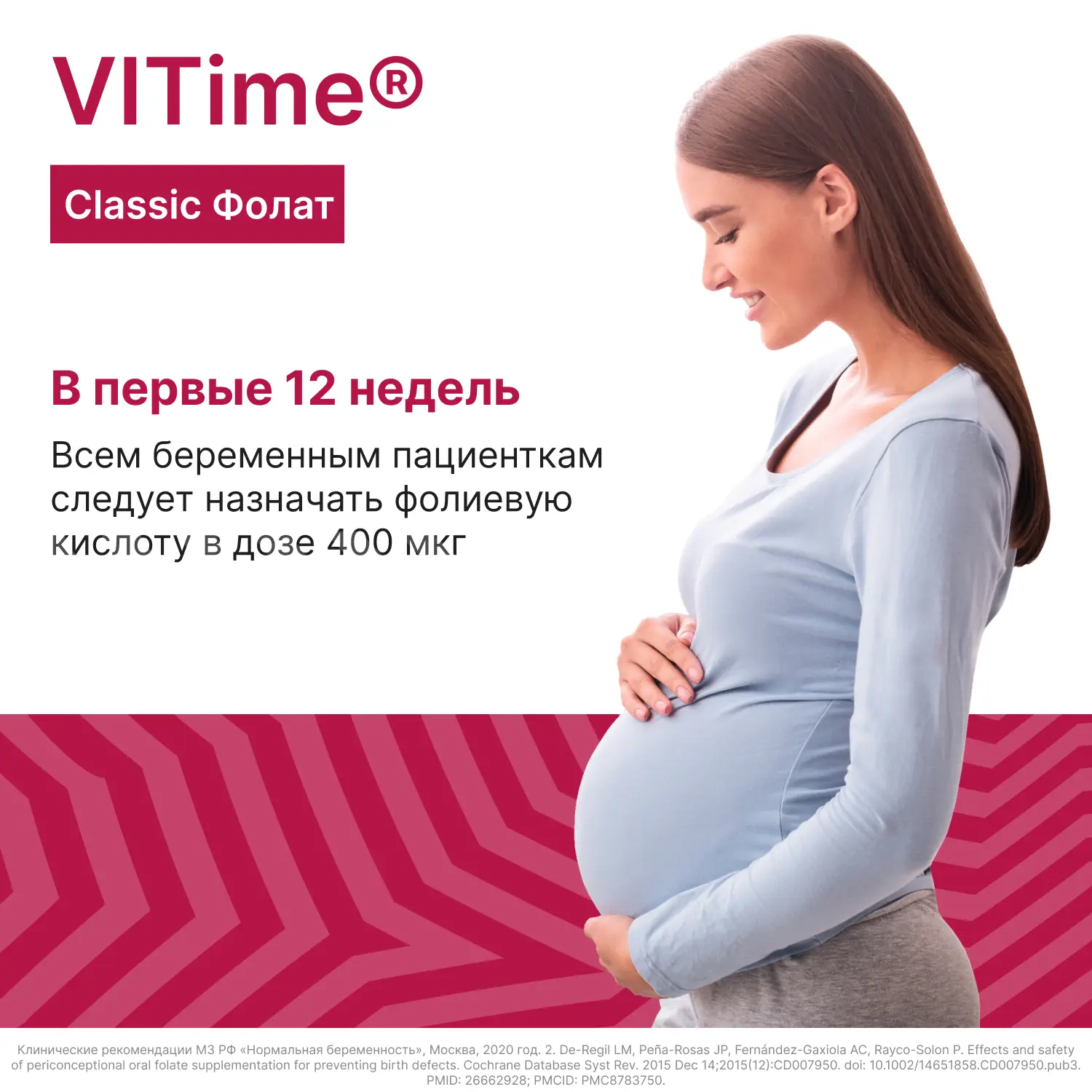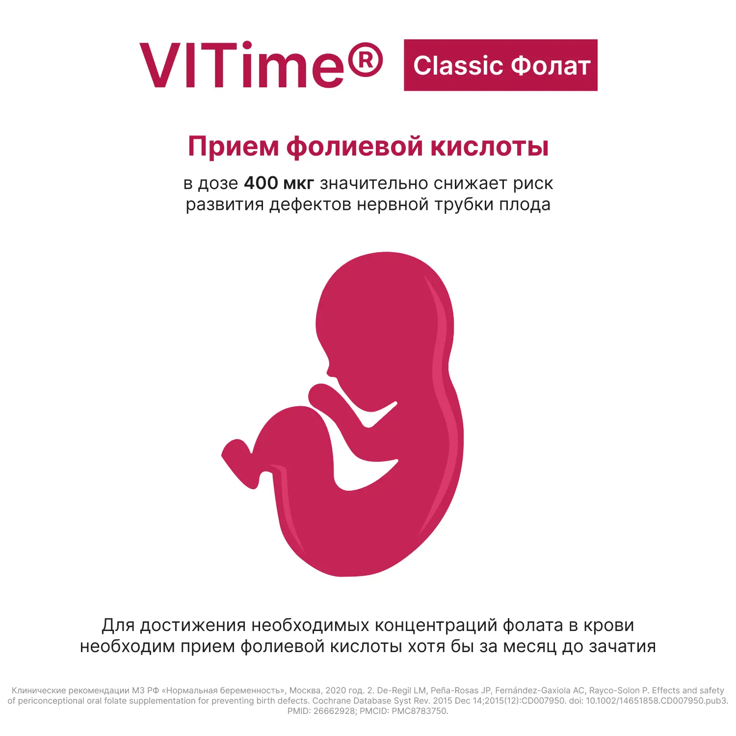 Содержание активных веществ в 1 капсуле VITime Classic Folate: витамин В9 (фолиевая кислота) не более 400 мкг.