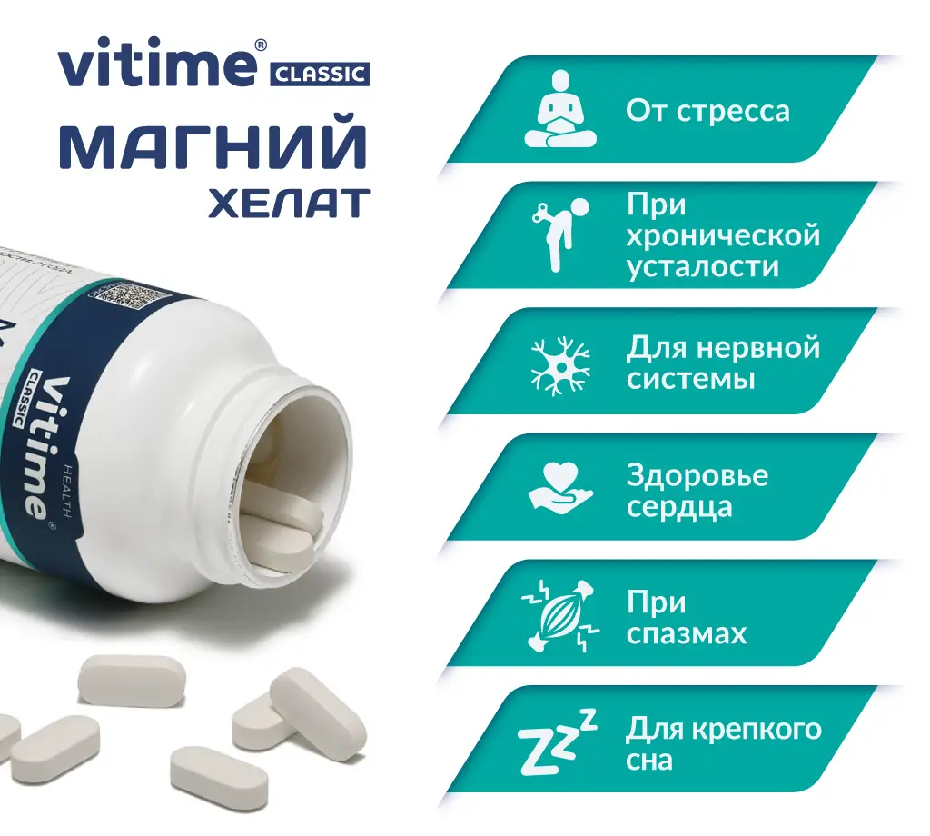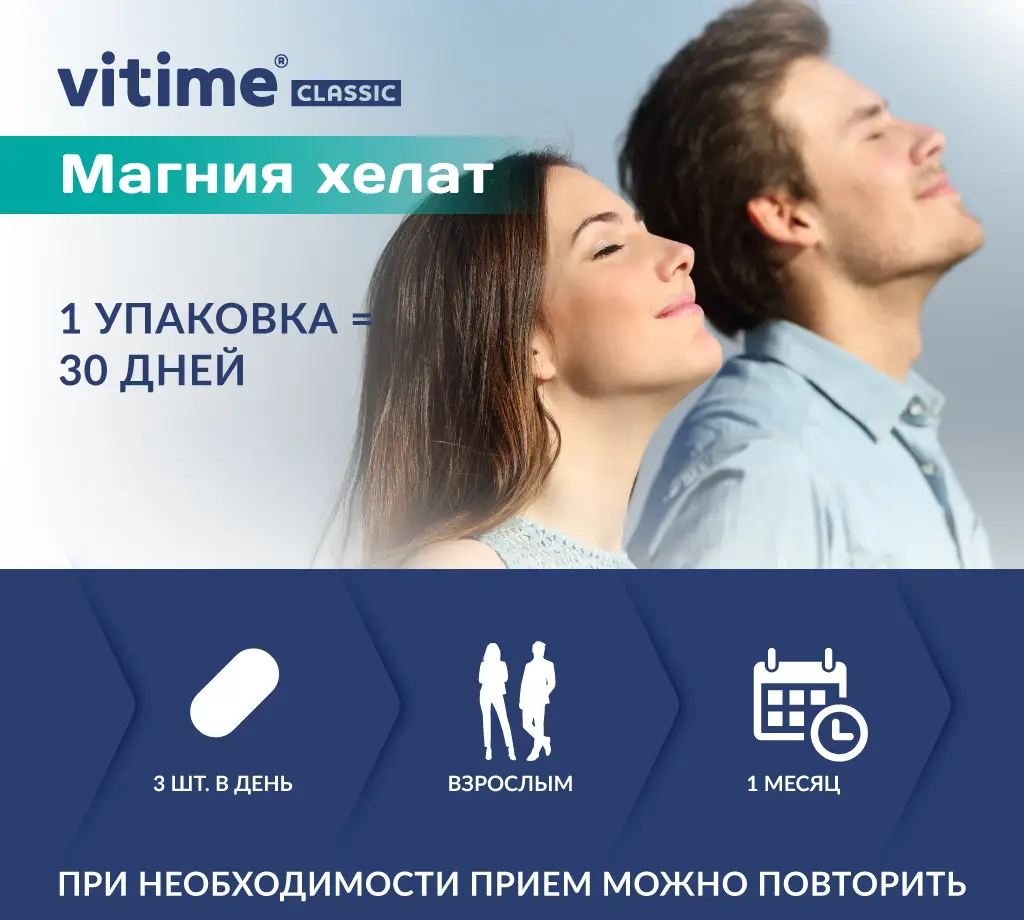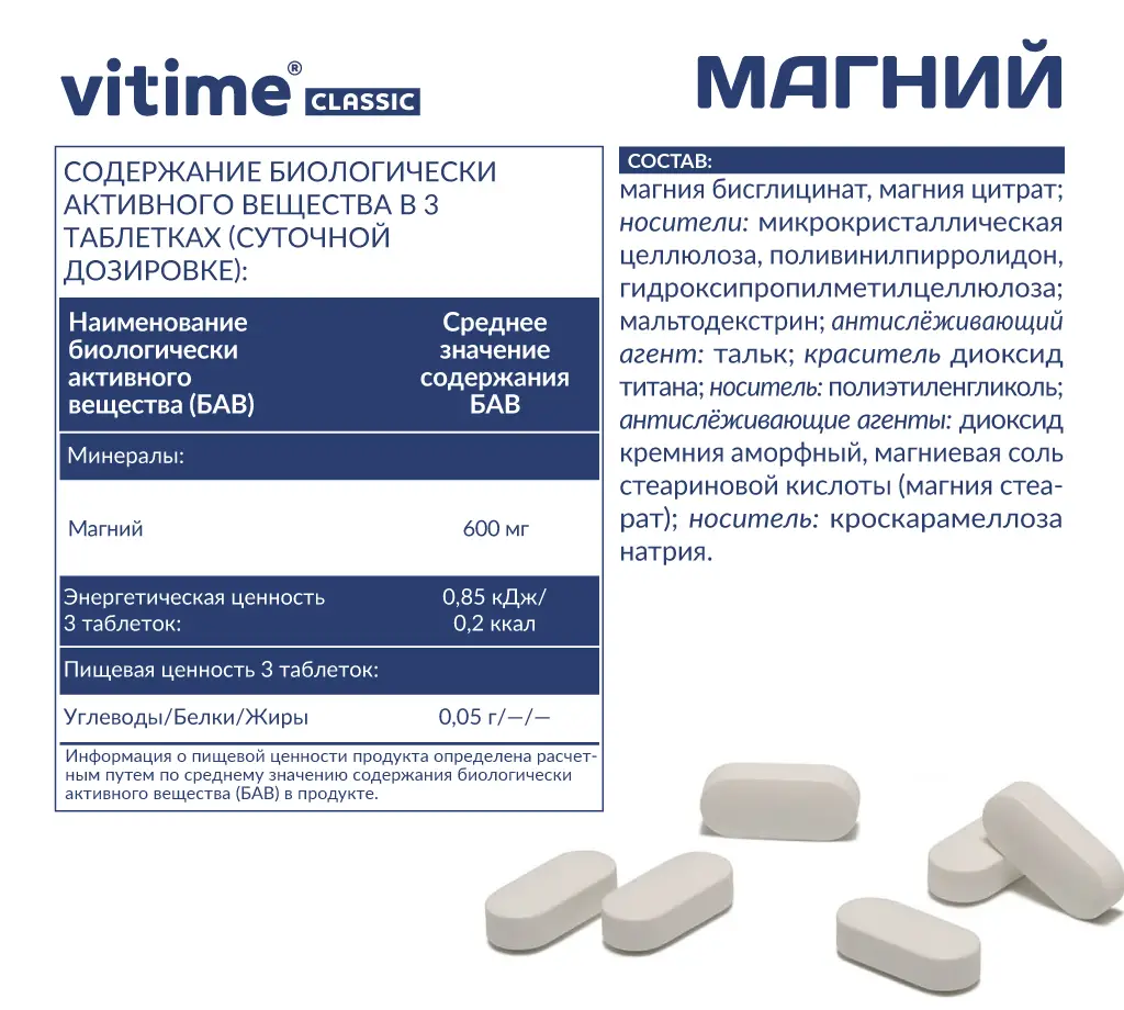 В 1 таблетке VITime Classic Magnesium chelate содержится 200 мг магния. Из них 60 мг в виде магния цитрата и 140 мг в виде магния бисглицината. Суточная дозировка — по 1 таблетке 3 раза в день.