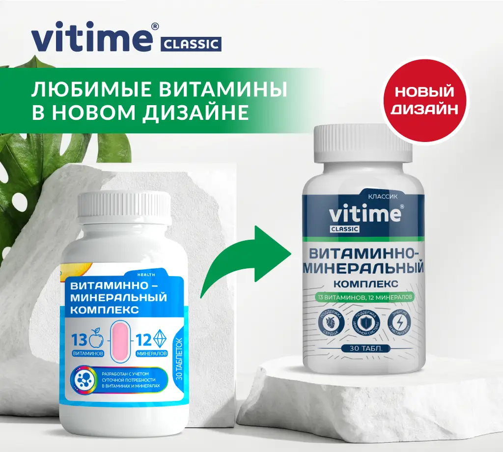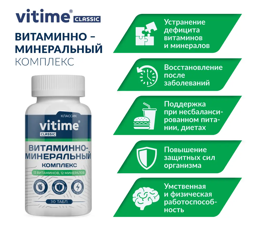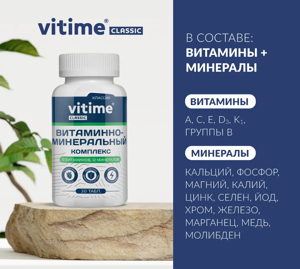 Комплекс VITime Classic, где 12 минералов и 13 витаминов - годен для общего укрепления и в периоды восстановления.