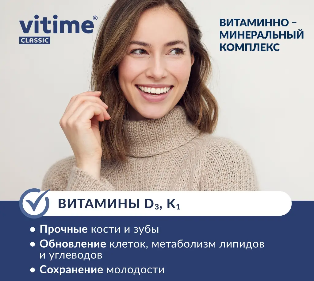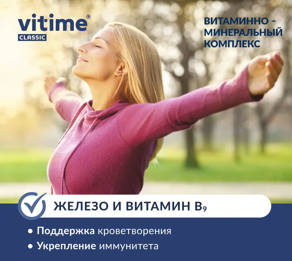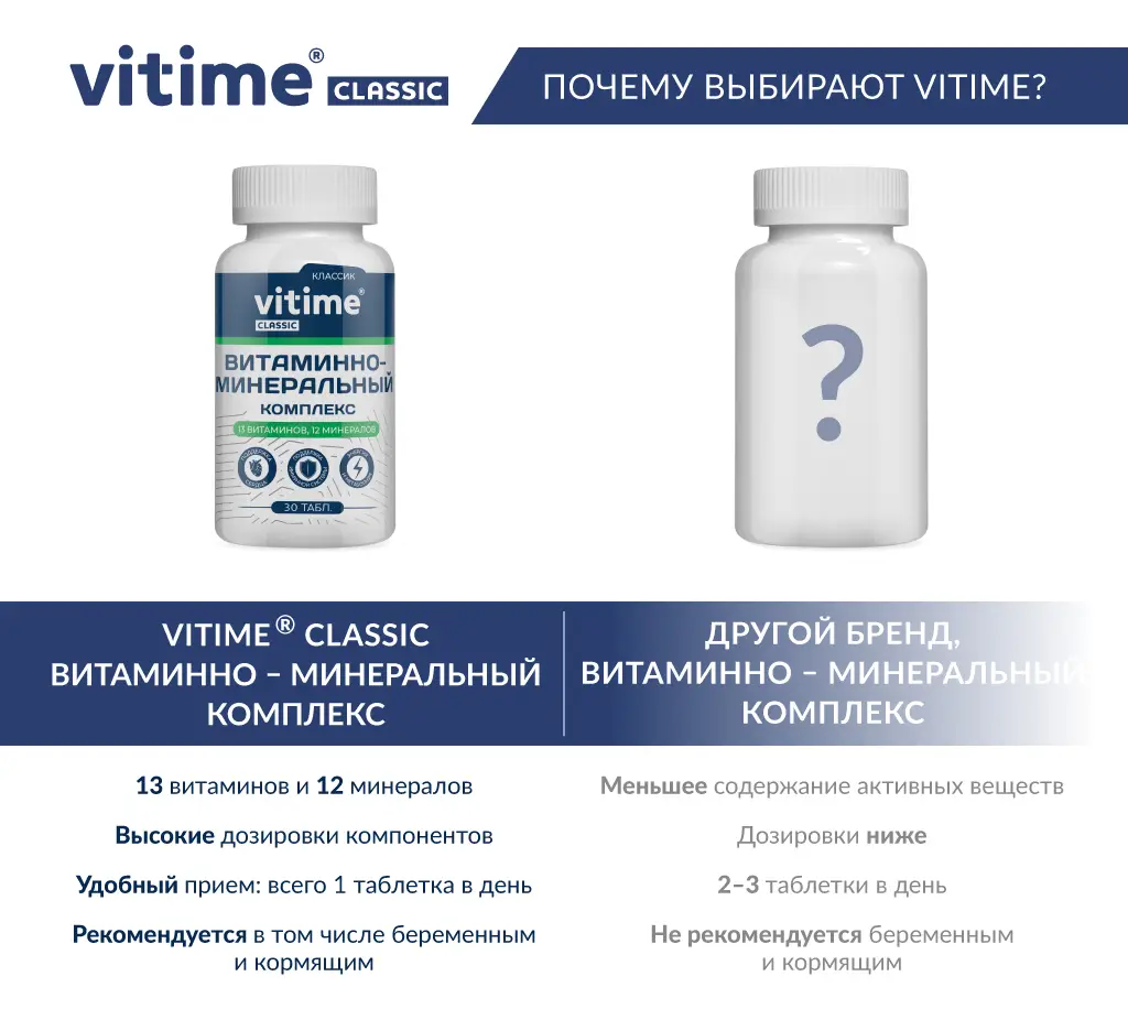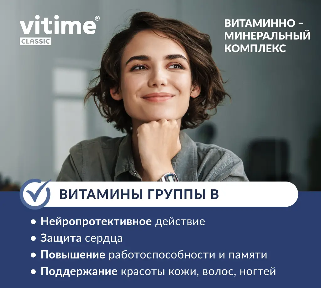 Комплекс VITime Classic, где 12 минералов и 13 витаминов - годен для общего укрепления и в периоды восстановления.