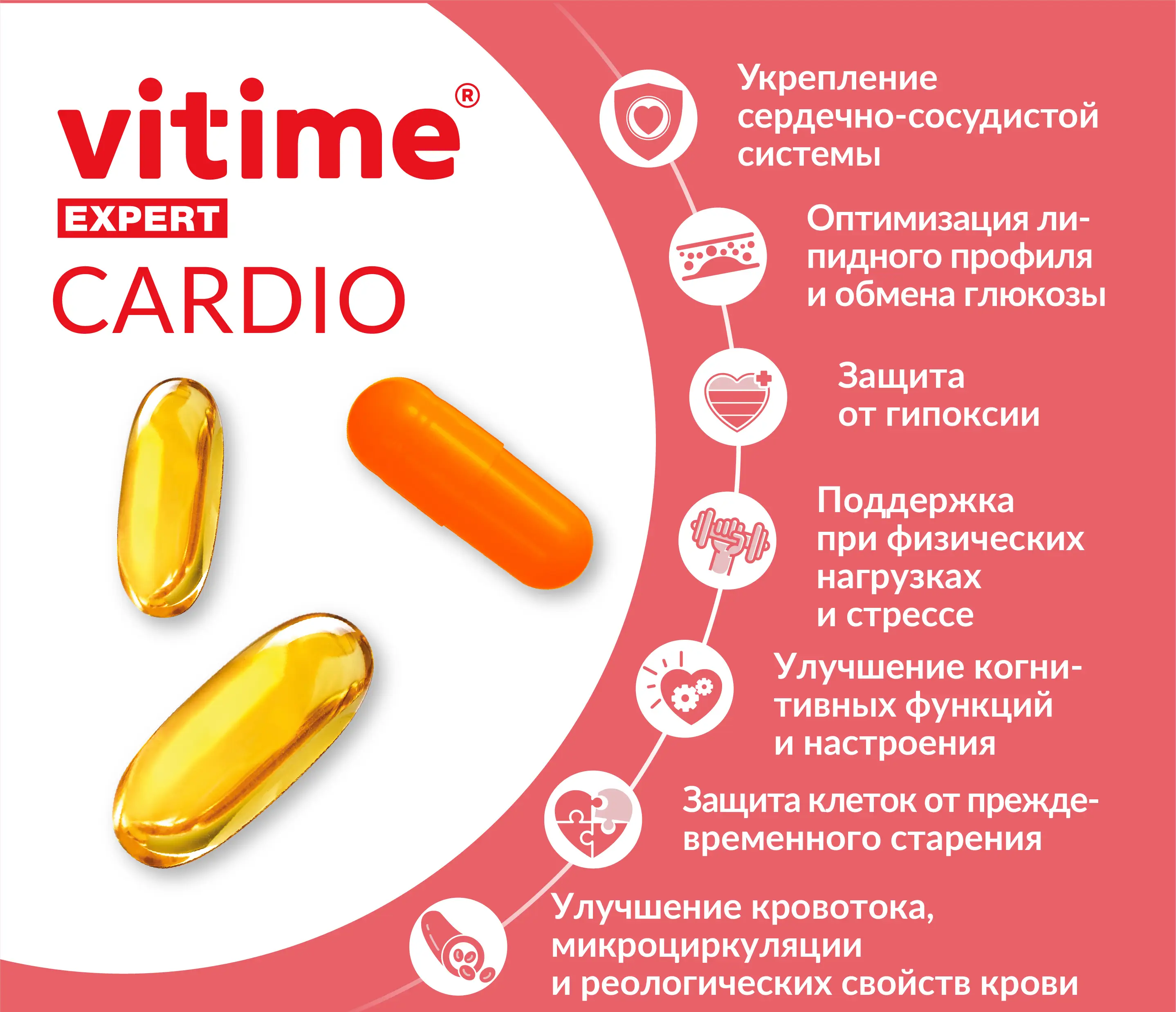 В комплексе Витайм эксперт кардио в составе идут активные антиоксиданты для защиты сердечно-сосудистой системы, плюс омега, ДГК и ЭПК для мозга, молодости и обновления клеток. Даже тем, кто занимается спортом, такой комплекс будет тоже очень полезен.