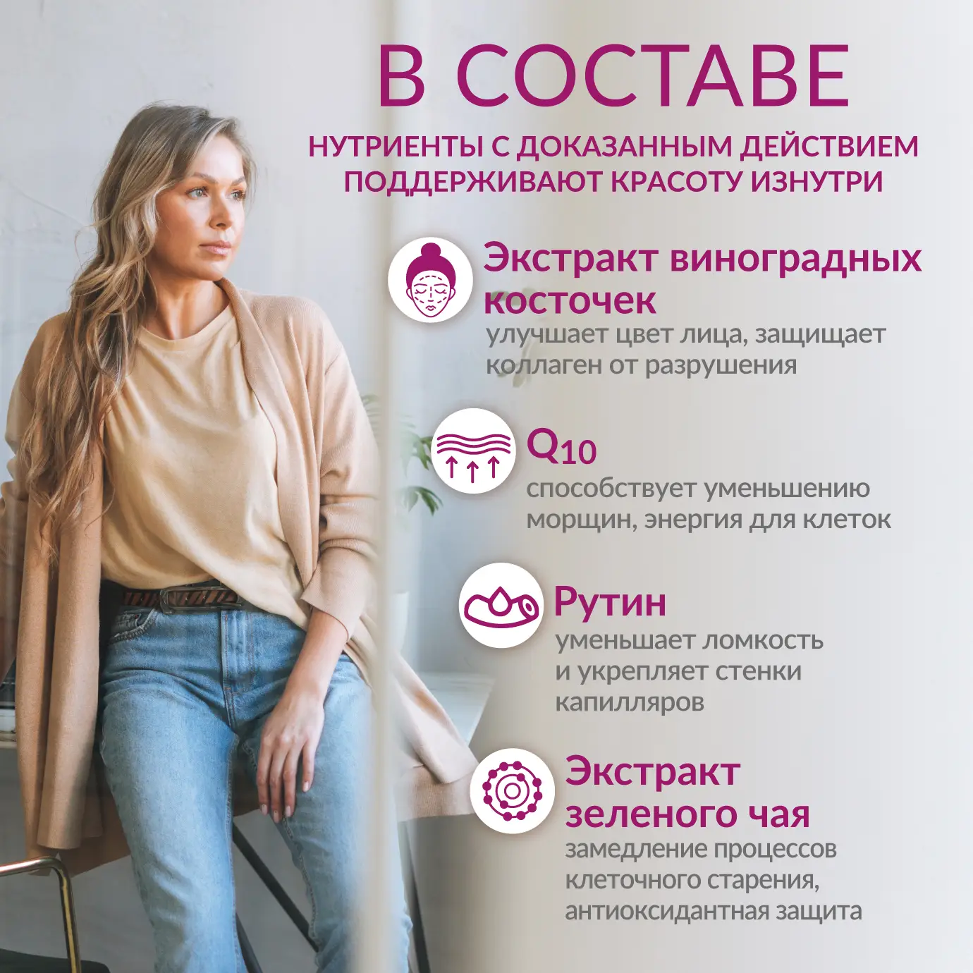 - Красота кожи, волос и ногтейОмега-3, коэнзим Q10, экстракт виноградных косточек, биотин, витамин Е, бета-каротин