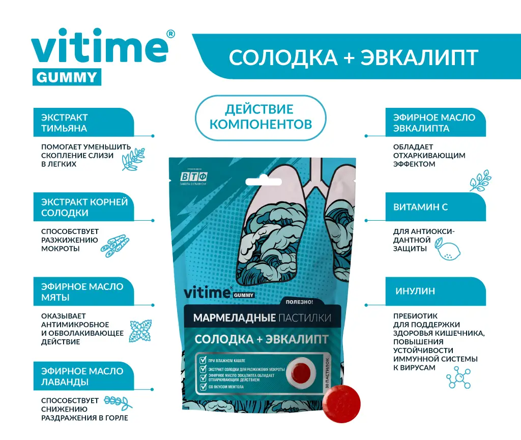 Мармеладные пастилки VITime® Gummy Солодка + эвкалипт содержат растительные экстракты тимьяна и корней солодки, эфирные масла эвкалипта, мяты, лаванды, пребиотик (инулин), а также витамин С для комплексной поддержки здоровья дыхательных путей и укрепления иммунитета.