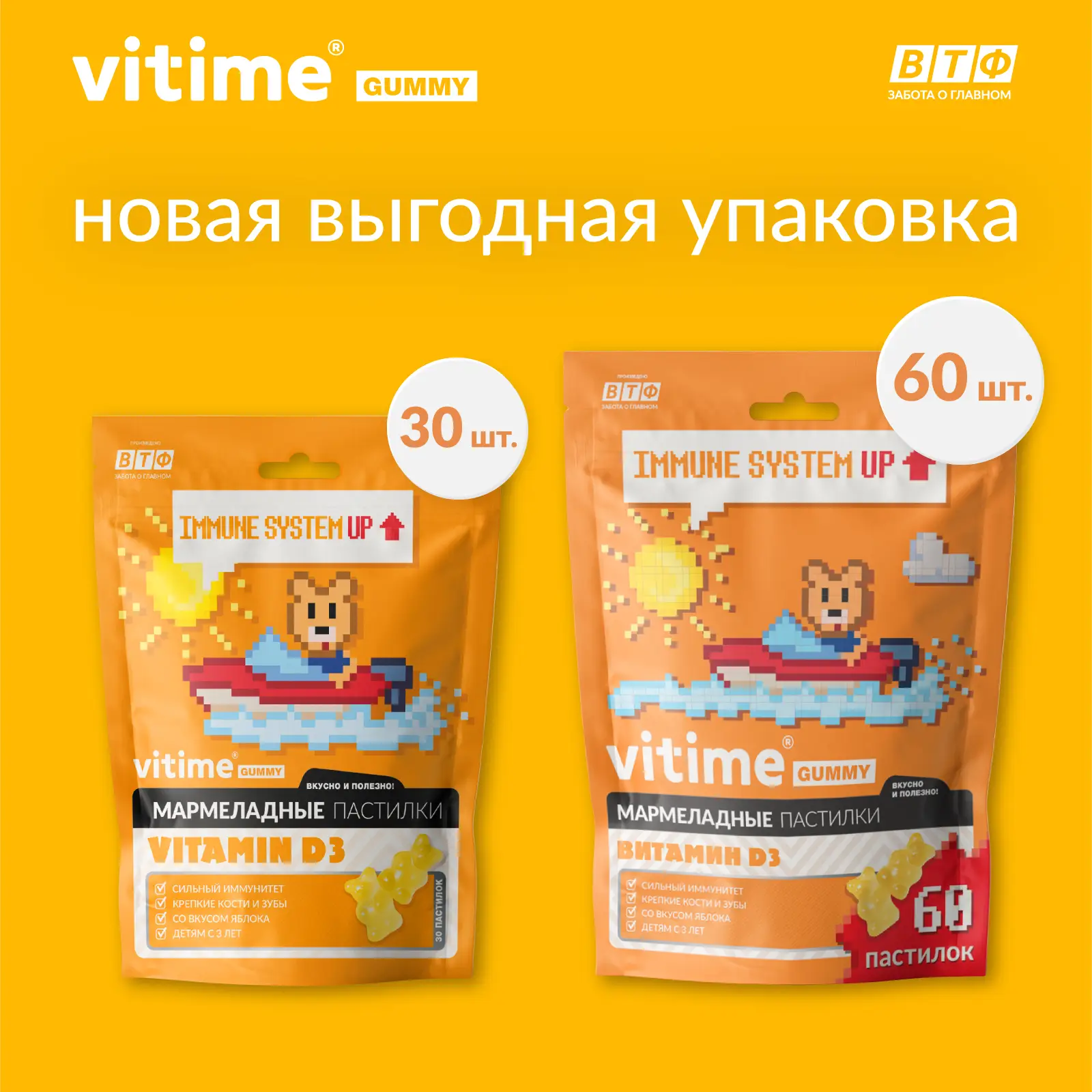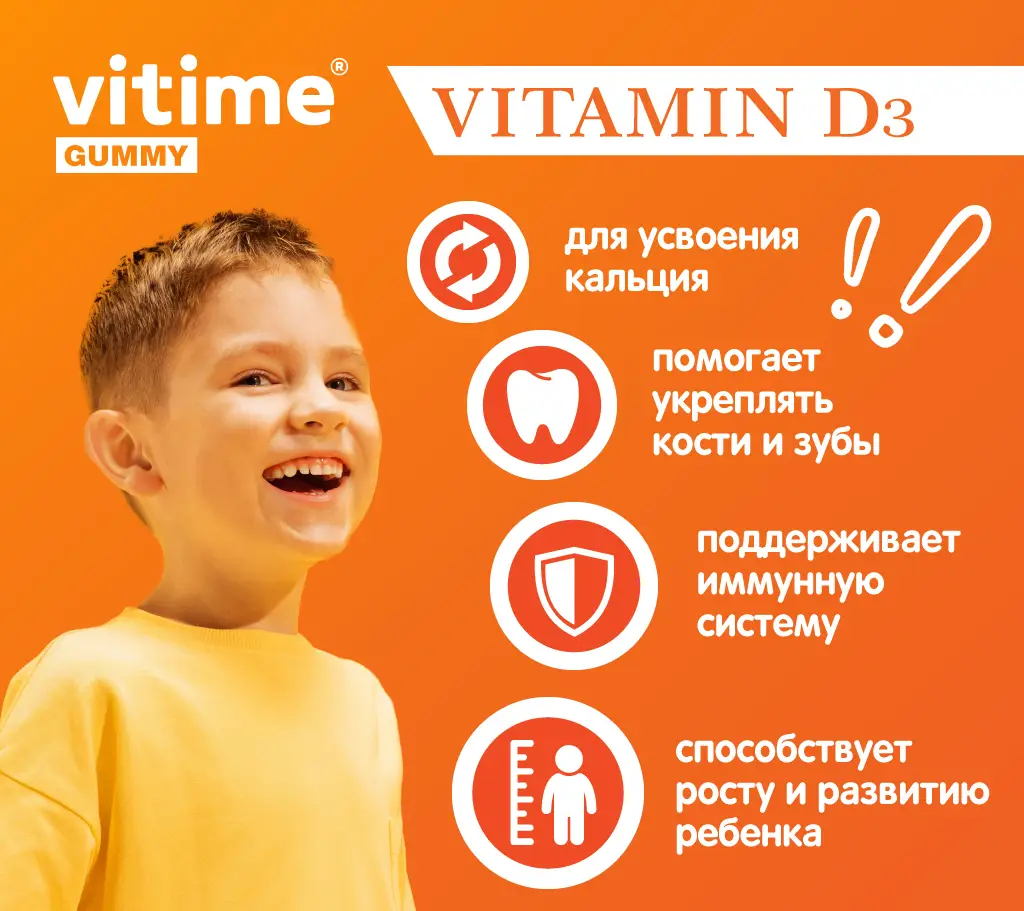 Возрастные ограничения связаны с формой выпуска VITime Gummy Витамин D3 – мармелад могут самостоятельно прожевать дети старше 3 лет.