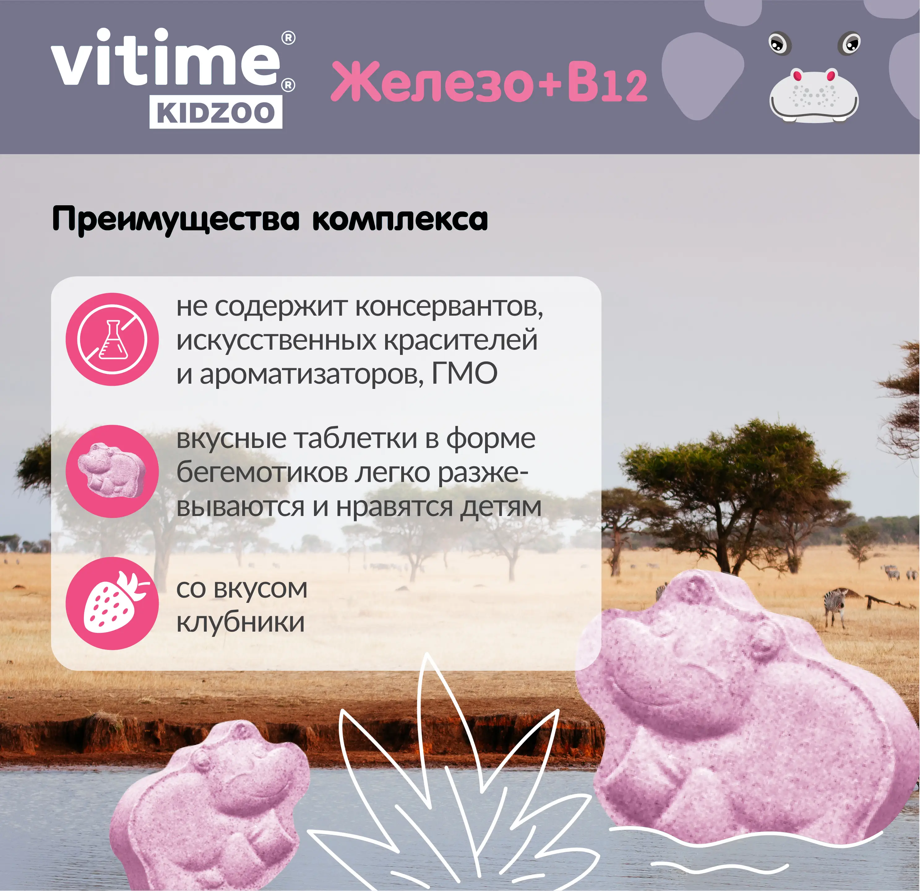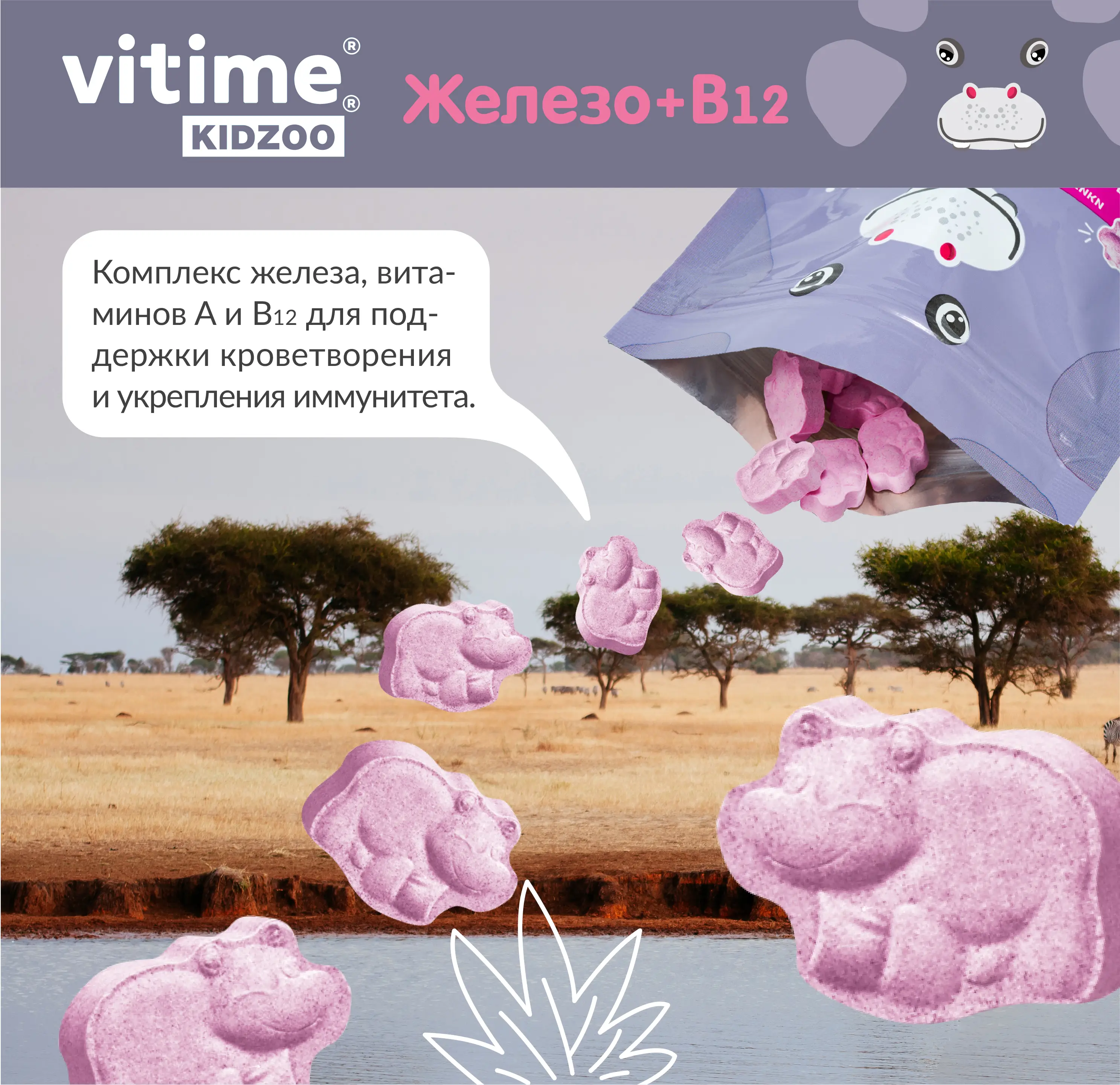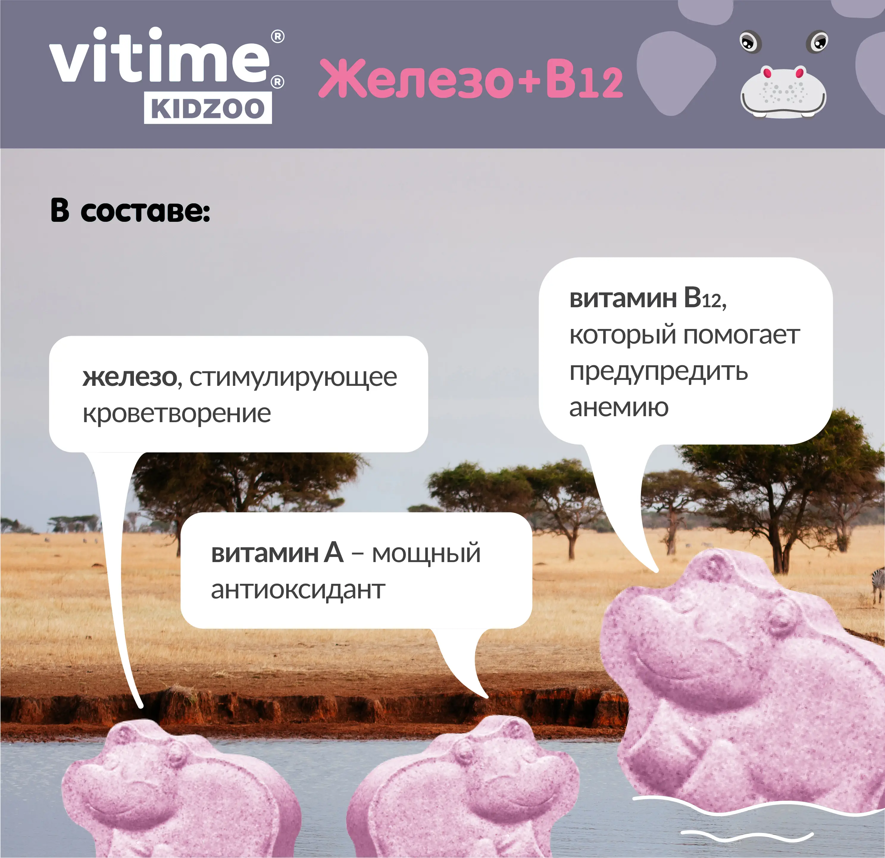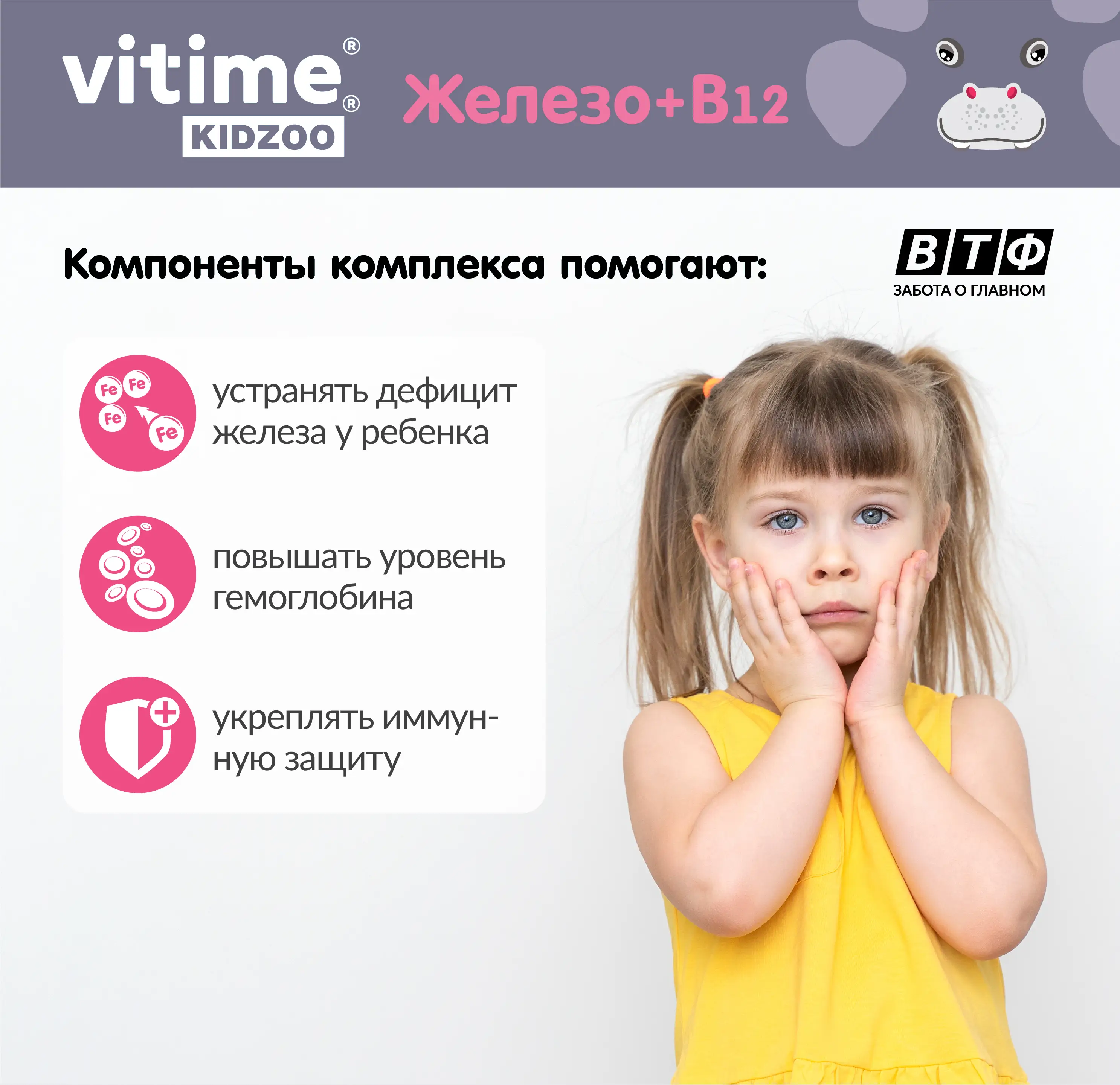 Продолжительность приема VITime Kidzoo Железо + В12 — 1 месяц. При необходимости прием можно повторить.