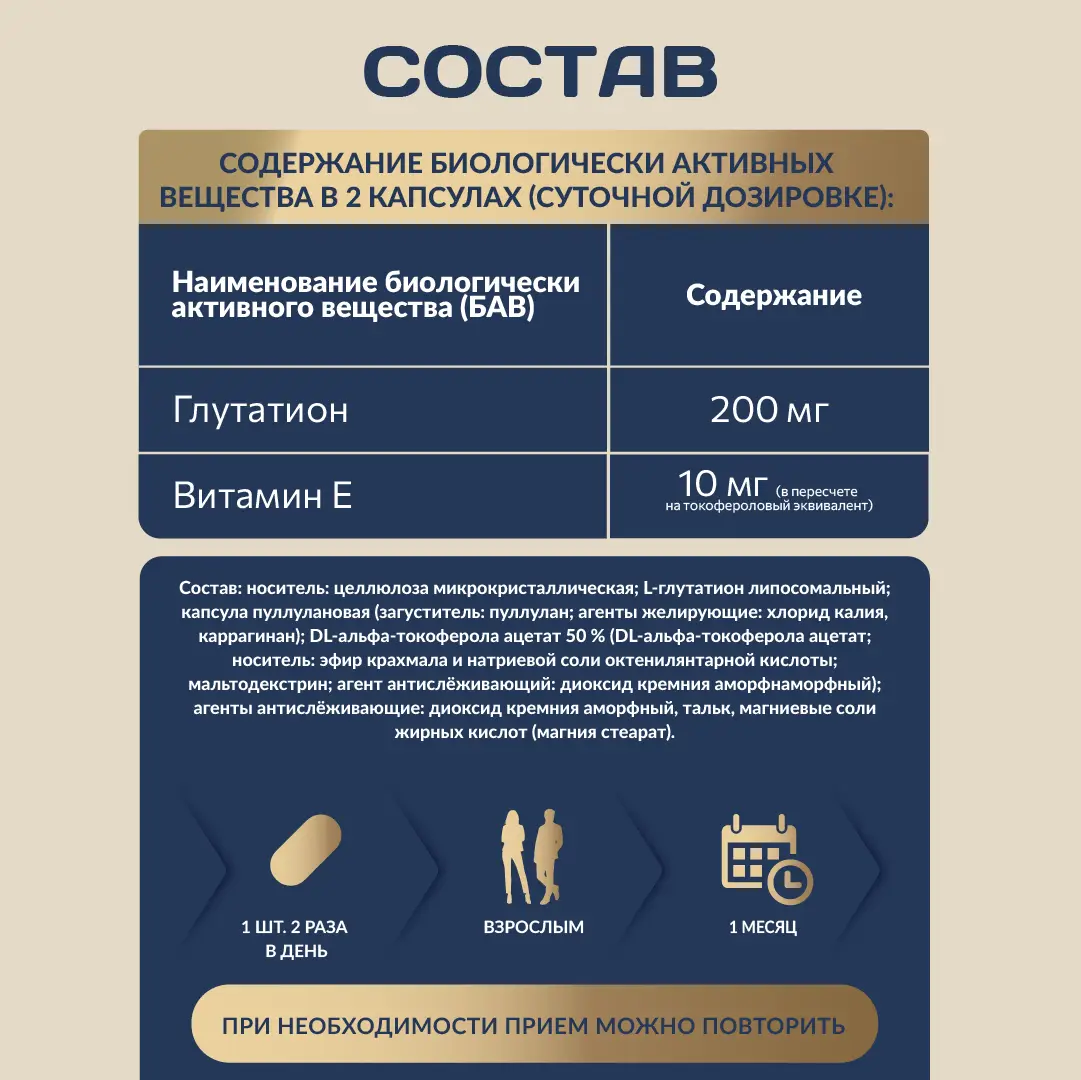 Витамин Е в составе выполняет вспомогательную функцию. Он помогает защищать липосомальную оболочку от окисления и поддерживает стабильность продукта. Кроме того, витамин Е и глутатион работают в комплексе: глутатион участвует в восстановлении окисленной формы витамина Е, поддерживая его антиоксидантную активность. Таким образом, их сочетание способствует более эффективной защите клеток.